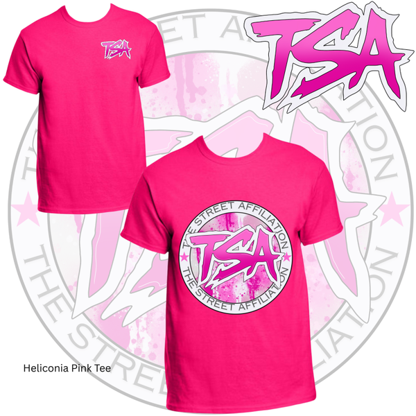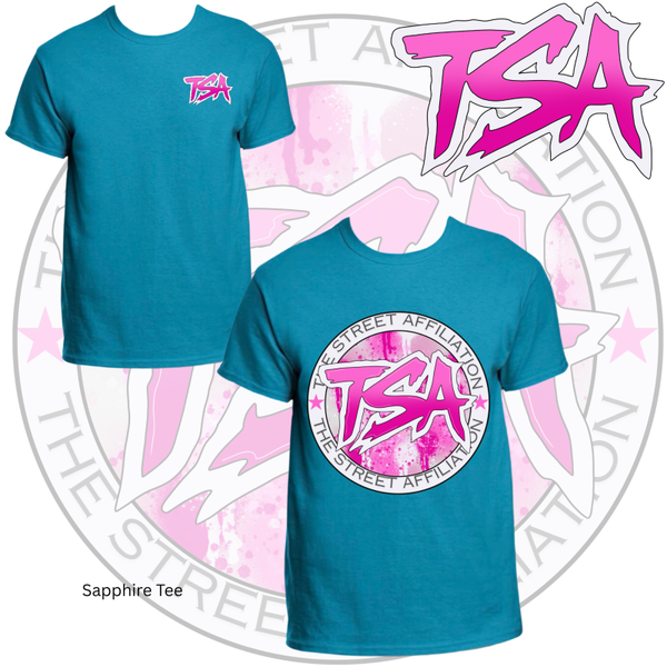 This bold clothing design features a circular emblem with "TSA" at the center, accented by splatter paint details and released in multiple vibrant colorways. The repeated logo serves as a signature mark, unifying the collection across a range of streetwear staples.