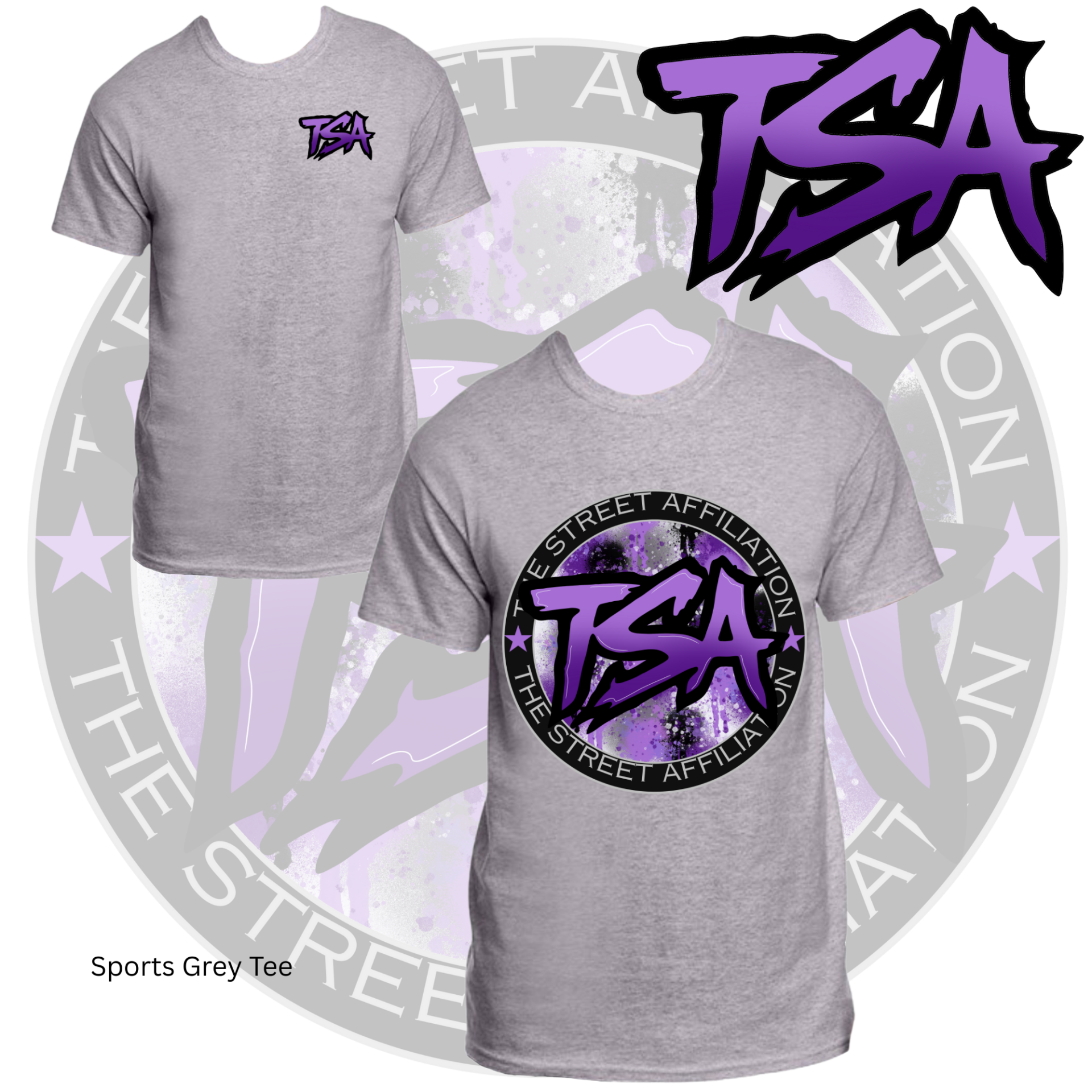 This bold clothing design features a circular emblem with "TSA" at the center, accented by splatter paint details and released in multiple vibrant colorways. The repeated logo serves as a signature mark, unifying the collection across a range of streetwear staples.