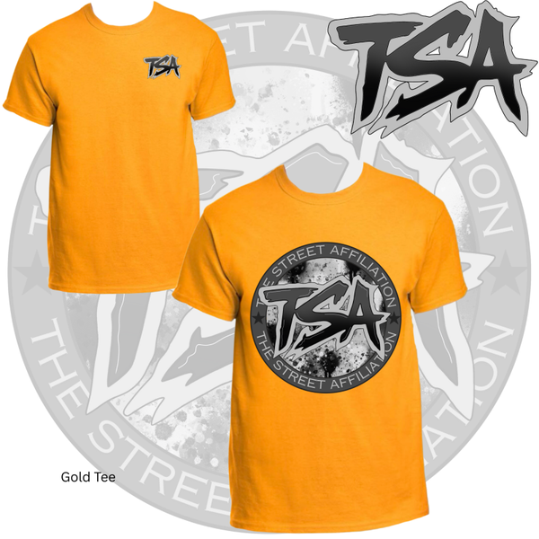 This bold clothing design features a circular emblem with "TSA" at the center, accented by splatter paint details and released in multiple vibrant colorways. The repeated logo serves as a signature mark, unifying the collection across a range of streetwear staples.
