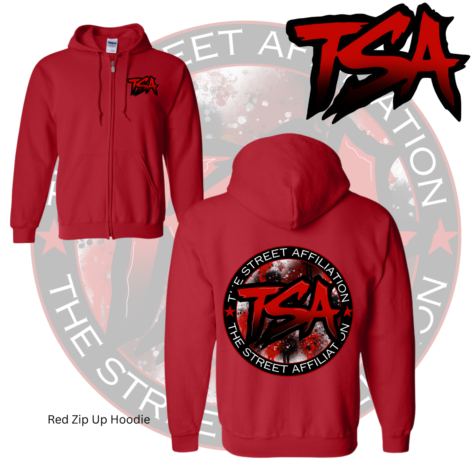 This bold clothing design features a circular emblem with "TSA" at the center, accented by splatter paint details and released in multiple vibrant colorways. The repeated logo serves as a signature mark, unifying the collection across a range of streetwear staples.