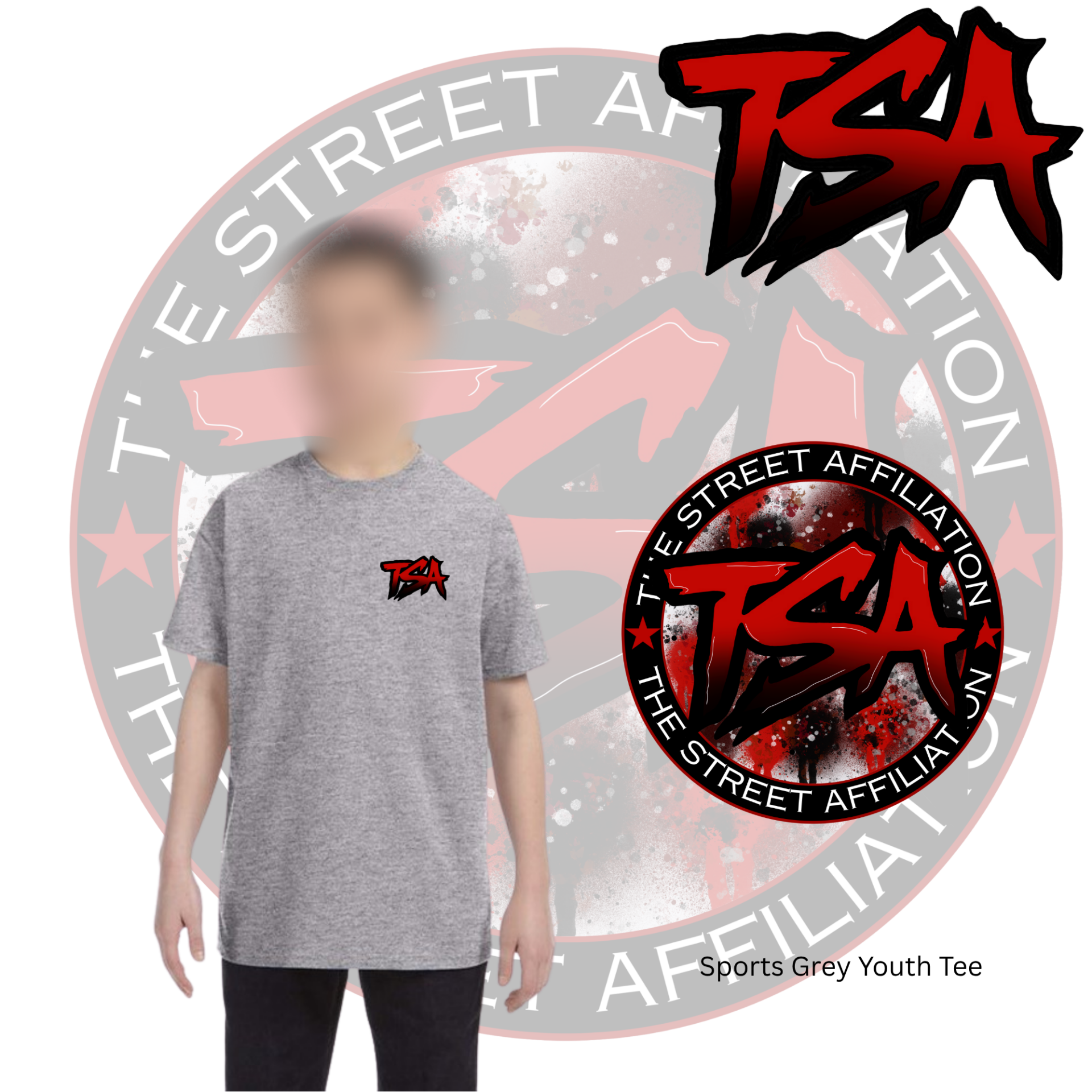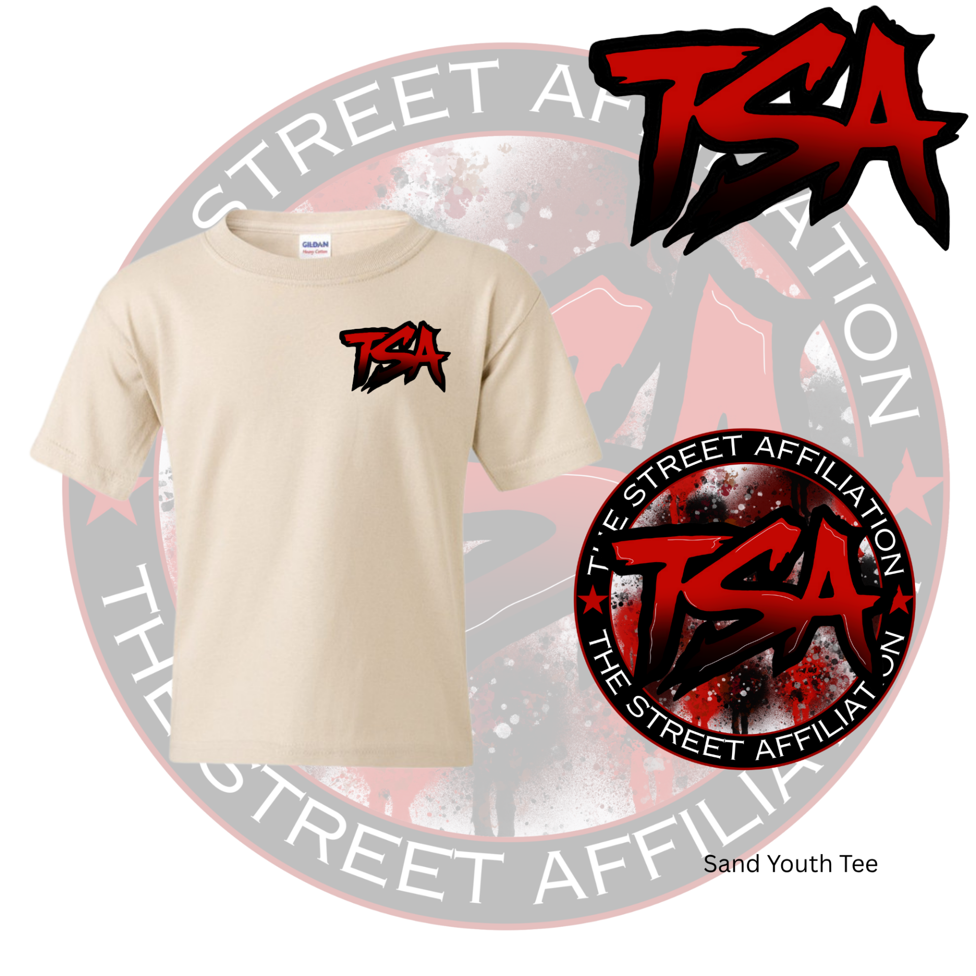 This bold clothing design features a circular emblem with "TSA" at the center, accented by splatter paint details and released in multiple vibrant colorways. The repeated logo serves as a signature mark, unifying the collection across a range of streetwear staples.