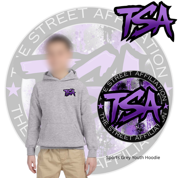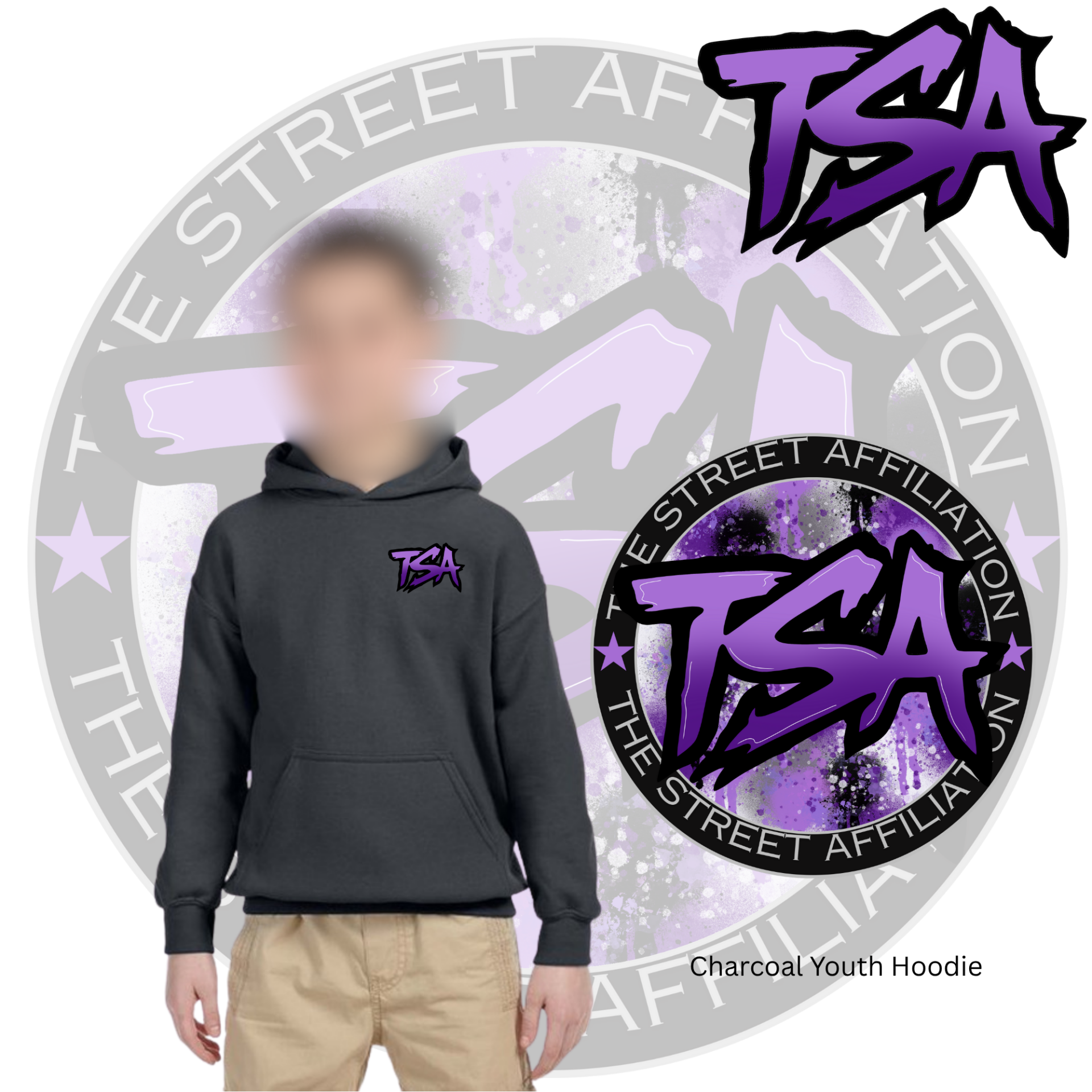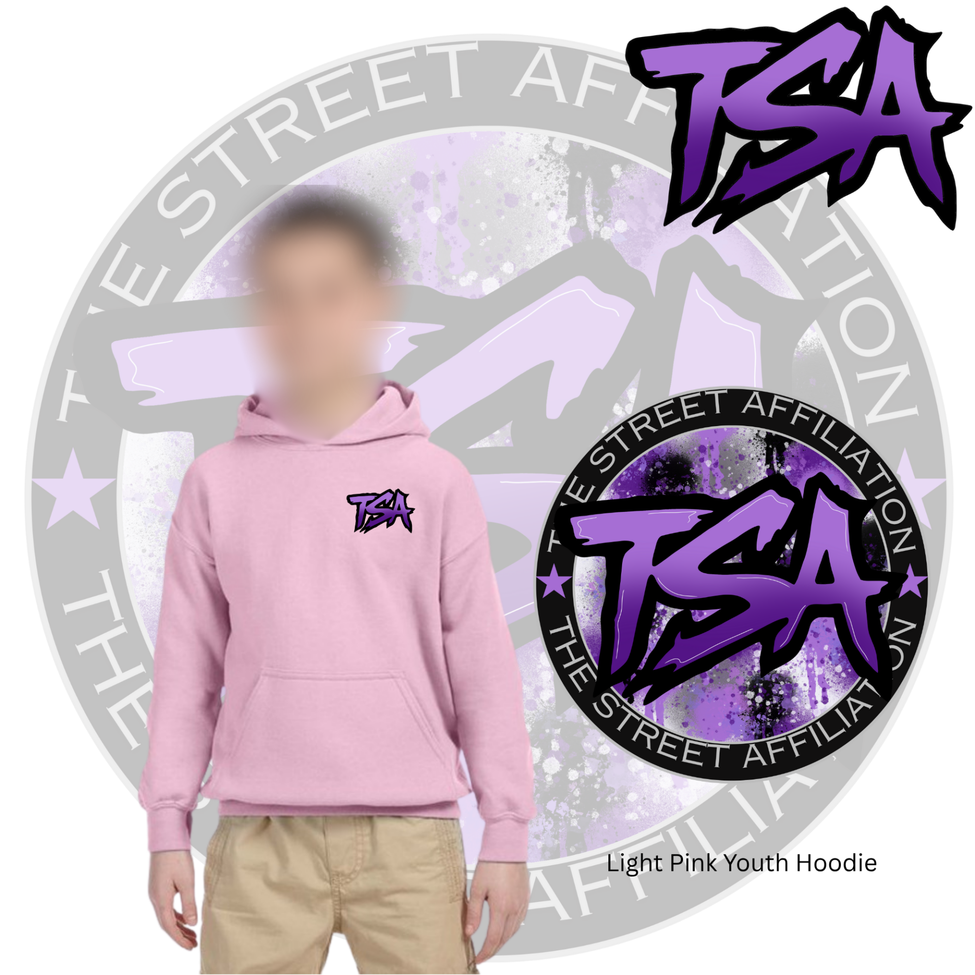 This bold clothing design features a circular emblem with "TSA" at the center, accented by splatter paint details and released in multiple vibrant colorways. The repeated logo serves as a signature mark, unifying the collection across a range of streetwear staples.