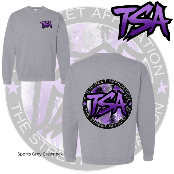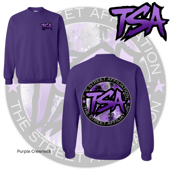 This bold clothing design features a circular emblem with "TSA" at the center, accented by splatter paint details and released in multiple vibrant colorways. The repeated logo serves as a signature mark, unifying the collection across a range of streetwear staples.